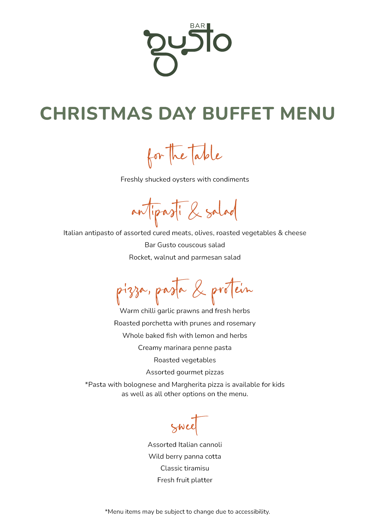 Sit back, relax and enjoy a generous Christmas Day lunch with oysters and antipasti, roasted porchetta and pasta, whole baked fish, authentic Italian pizzas prepared by our Pizzaiolos, along with delicious salads, sides and desserts.